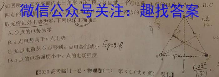 如图所示,真空平面内正三角形ABC顶点各固定一个点电荷,A点的电荷量为+2q,B、C两点的电荷量为一q,O点为三角形的中心,a、b、c为各边的中点,+2取取无无穷远处电势为零,下列说法正确的是32gK里A.O点的电势为零B.a点电势高于b点电势C.负点电荷从O点移到a点电势能减小aEp=24D.a点的电场强度小于c点的电场强度B22&1