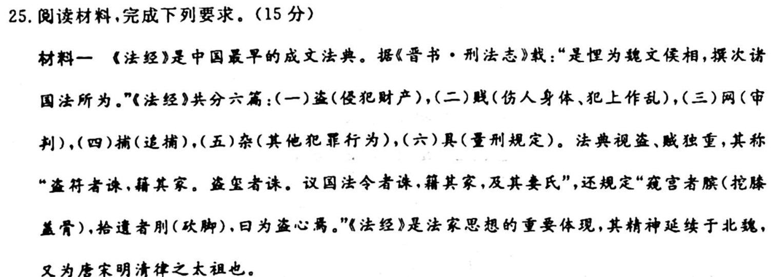 25.阅读材料,完成下列要求。(15分)材料一《法经》是中国最早的成文法典。据《晋书·刑法志》载:“是悝为魏文侯相,撰次讲国法所为。”《法经》共分六篇:(一)盗(侵犯财产),(二)贱(伤人身体、犯上作乱),(三)网(审判),(四)捕(追捕),(五)杂(其他犯罪行为),(六)具(量刑规定)。法典视盗、贼独重,其称“盗符者谏,籍其家。盗玺者诛。议国法令者诛,籍其家,及其妻氏”,还规定“窥宫者膑(挖膝骨),拾遺者刖(砍脚),曰为盗心焉。”《法经》是法家思想的重要体现,其精神延续于北魏,又为唐宋明清律之太祖也。—摘编自张中秋《中西法律文化比较研究》