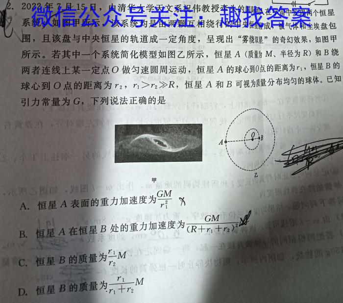 22.2022年7月15日,由清华大学天文系祝伟教授牵头的国际队在宇宙中发现两个恒早系统如图甲所示,该系统均是由两颗互相绕行的中央恒成,被气体和尘埃盘包围,且该盘与中央恒星的轨道成一定角度,呈现出“雾绕双星”的奇幻效果,如图甲所示。若其中一个系统简化模型如图乙所示,恒星A(质量为M、半径为R)和B绕两者连线上某一定点O做匀速圆周运动,恒星A的球心到点的距离为r1,,恒星B的r2,r1>r2>R,球心到O点的距离为r2,rr2>R,恒星A和B可视为质量分布均匀的球体。已知引力常量为G,下列说法正确的是0AA.恒星A表面的重力加速度为GMr1^2XpiB.恒星A在恒星B处的重力加速度为GM(R+r1+r2)^2C.恒星B的质量为r1r2MD.恒星:B的质量为r1r1+r2M