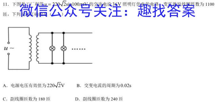 11.下图是工厂利用u=2202100tV的交流电给36V照明灯供电的电路,变压器原线圈匝数为1100匝,下列说法正确的是()A.电源电压有效值为2202vB.交变电流的周期为0.02sC.副线圈匝数为180匝D.副线圈匝数为240匝