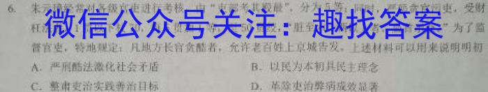 6.朱元璋经常对各级官吏进行考核,由“吏部考其殿最,分为5等:同时,平惩贪官污吏,受财枉法者,贯以下秋70.每5贯加1等,至50贯绞,“脏至六十两以上者,枭首示众。”为了监督官吏,特地规定:凡地方长官贪酷者,允许老百姓上京城告发,上述材料可以用来说明明初A.严刑酷法激化社会矛盾B.以民为本初具民主理念C.整肃吏治实践善治目标D.革除吏治弊病成效显著