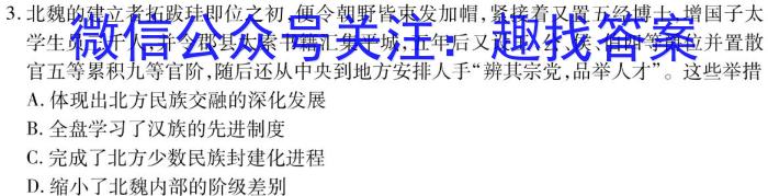 3.北魏的建立者拓跋珪即位之初,便令朝野皆束发加帽,紧接着又置五经博士,增国子太学生员三千人,并令郡县大索书籍汇集平城,五年后又设王、公、侯、伯四等爵位并置散官五等累积九等官阶,随后还从中央到地方安排人手“辨其宗党,品举人才”。这些举措A.体现出北方民族交融的深化发展B.全盘学习了汉族的先进制度C.完成了北方少数民族封建化进程D.缩小了北魏内部的阶级差别