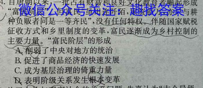 4.自唐朝以来,一批占有财富和良好文化教育者崛起形成“富民阶层”。但富民“虽田连阡陌,家资钜万,亦只与耕种负贩者同是一等齐民”,没有任何特权。伴随国家赋税征收方式和乡里制度的变革,富民逐渐成为乡村控制的主要力量。“富民阶层”的形成A.削弱了中央对地方的统治B.促进了商品经济的快速发展C.成为基层治理的倚重力量D.表明阶级关系发生根本变革