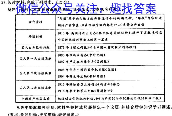 27.阅读材料,完成下列要求。(12分)材料报刊的发展映射着政治格局、社会生活、思想观念的变迁。从表中提取相关信息,就材料整体或局部拟定一个论题,并结合所学知识予以阐述。(要求:论题明确,史实准确,表述清晰。)