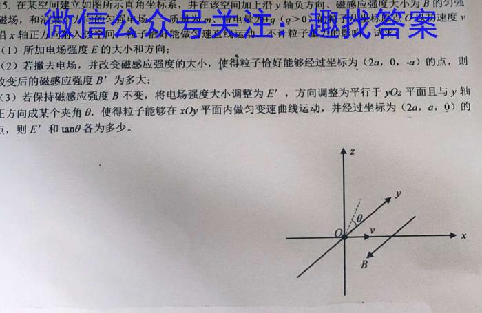 15.在某空间建立如图所示直角坐标系,并在该空间加上沿y轴负方向、磁感应强度大小为B的匀强磁场,和沿某个方向的匀强电场.一质量为m、带电量为+q(q>0)的粒子从坐标原点O以初速度v沿x轴正方向射入该空间,粒子恰好能做匀速直线运动.不计粒子重力的影响,试求:(1)所加电场强度E的大小和方向;(2)若撤去电场,并改变磁感应强度的大小,使得粒子恰好能够经过坐标为(2a,0,-a)的点,则改变后的磁感应强度B'为多大;(3)若保持磁感应强度B不变,将电场强度大小调整为E',方向调整为平行于yOz平面且与y轴正方向成某个夹角0,使得粒子能够在xOy平面内做匀变速曲线运动,并经过坐标为(2a,a,0)的点,则E'和tanθ各为多少。