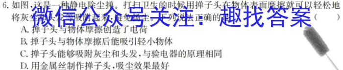 6.如图,这是一种静电除尘掸。打扫卫生的时候用掸子头在物体表面摩擦就可以轻松地将灰尘和头发等吸附起来,避免扬尘。下列说法正确的是()A.掸子头与物体摩擦创造了电荷B.掸子头与物体摩擦后能吸引轻小物体C.掸子头能够吸附灰尘和头发,与验电器的原理相同D.用金属丝制作掸子头,吸尘效果最好