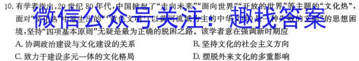 10.有学者指出,20世纪80年代,中国掀起了“走向未来”“面向世界”“开放的世界”等主题的“文化热”,面对“文化热”中滋生出的“黄色文明”(以黄河流域为主的中华文明)是一种失败的文明”的思想困境,坚持“四项基本原则”无疑是最为正确的脱困之路。该学者意在强调新时期应A.协调政治建设与文化建设的关系B.坚持文化的社会主义方向C.致力于建设多元一体的文化格局D.摆脱外来文化的多重影响