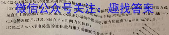 重14.(12分)用如图所示模型来研究重力场、电场作用下的偏转运动。空间存在斜向上与重力成120^角的匀强电场,方向如图所示示。下的偏转运动。空空间120夹角的匀强电场,方向如图所示。现给一质量t-0.5kg、带电量q=+10³C的小球一个,小竖直向上的初速度v=10m/s,小球正好做类平抛运动,重力加速度为m=0.5kg、量qq=+10^-3C(1)电场强度E,以及小球在2s时间内的位移;重力力加速度为g=10g=10m/s^2,g=10m/s,求:(2)经过2s,小球电势能的变化量与重力势能的变化量之比。变变化最之比。