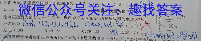 6.如图所示,某理想变压器三个线圈匝数之比为n1:n2:n3=2:5:3,灯泡L1、L2、L3的电阻之比为R1:R2:R3=1:1:2,变压器原线圈所接正弦交流电压的最大值U1m=202V。则闭合开关K前后,通过原线圈的电流大小之比为Pn涵U,I=U2I2+U6I322工=5×5&1+3×3&2=29.5&21&12=5Kn2L1L2n1n3A.59:109B.49:99C.39:89=105D.29:7927÷5×5&95+3×3&=50.5&2≈