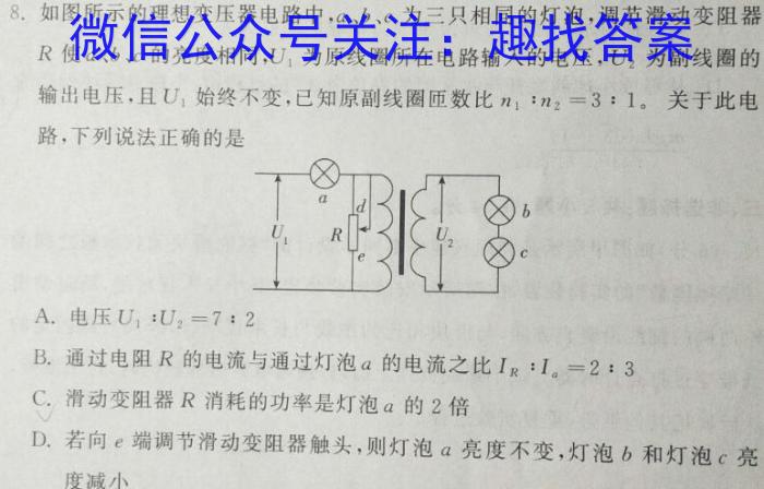 8.如图所示的理想变压器电路中,a、b、c为三只相同的灯泡,调节滑动变阻器R使a、b、c的亮度相同,U1为原线圈所在电路输入的电压,U2为副线圈的输出电压,且U1始终不变,已知原副线圈匝数比n1:n2=3:1。。关于此电路,下列说法正确的是A.电压U1:U2=7:2B.通过电阻R的电流与通过灯泡a的电流之比IR:Ia=2:3C.滑动变阻器R消耗的功率是灯泡a的2倍D.若向e端调节滑动变阻器触头,则灯泡a亮度不变,灯泡b和灯泡c亮度减小