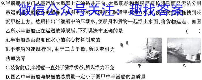9.半潜船是专门从事运输大型海上石油钻井平台、大型舰船和潜艇等超长超重而又无法分割吊运的超大型设备的船舶。如图甲所示,半潜船把装货甲板潜入水中,使货物能够拖拽到装货甲板上方。然后排出半潜船中的压载水,使船身和货物一起浮出水面,将货物运走。如图乙所示半潜船正在运送故障舰艇,下列说法中正确的是()A.半潜船是由密度比水小的实心材料制成的B.半潜船匀速航行时,由于二力平衡,所以牵引力功率为零C.装货前后,半潜船一直处于漂浮状态,所以浮力不变D.图乙中半潜船与舰艇的总质量一定小于图甲中半潜船的总质量