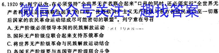 6.1920年,列宁认为,在必须坚持“全世界无产者联合起来”口号的同时,还必须实行“全世界无产者和被压迫民族联合起来”的口号,“使西欧共产主义无产阶级与东方各殖民地以至一切落后国家的农民革命运动结成尽可能密切的联盟”。列宁意在号召A.无产阶级必须领导本国的民族解放运动::yAN….B.国际无产阶级应联合起来支持苏俄革命C.将世界无产阶级革命与民族解放运动结合D.各国无产阶级要与本国资产阶级联合斗争