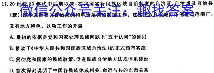 11.20世纪80年代中后期以来,在我国实行民族区域自治制度的自治区、自治州及自治县(旗),逐步进行有关自治条例和单行条例的制定工作。这些民族自治地方条例覆盖范围广,又有地方特色。这项工作的开展A.最初的依据是党和国家处理民族问题上“五个认同”的原则B.推动了《中华人民共和国民族区域自治法》的正式颁布实施C.贯彻党和国家的民族政策,促进民族自治地方法规体系建设D.首次深刻说明了中国各民族休戚相关,命运与共的血肉关系