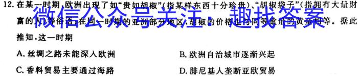 12.在某一时期,欧洲出现了如“贵如胡椒”(指某样东西十分珍贵)、“胡椒袋子”(指拥有大量财离的人)等俗语;在同一时期的亚洲部分地区,胡椒的价格也与同等重量的黄金相等。据此推知,这一时期A.丝绸之路未能深人欧洲B.欧洲自治城市逐渐兴起C.香料贸易主要通过海路D.腓尼基人垄断亚欧贸易