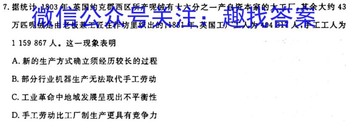 7.据统计,1803年,英国约克郡西区所产呢绒有十六分之一产自资本家的大工厂,其余大约43万匹呢绒是由老板兼工匠在作坊里织出的;1831年,英国工厂工人为404317人,手工工人为1159867人。这一现象表明A.新的生产方式确立须经历较长的过程B.部分行业机器生产无法取代手工劳动C.工业革命中地域发展呈现出不平衡性D.手工劳动比工厂制生产更具有竞争力