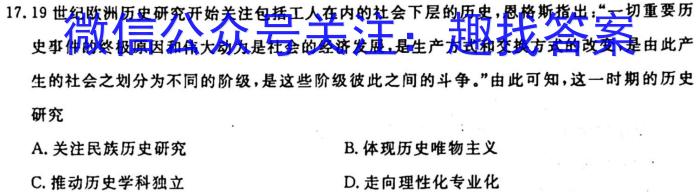 17.19世纪欧洲历史研究开始关注包括工人在内的社会下层的历史,恩格斯指出:“一切重要历史事件的终极原因和伟大动力是社会的经济发展,是生产方式和交换方式的改变,是由此产生的社会之划分为不同的阶级,是这些阶级彼此之间的斗争。”由此可知,这一时期的历史研究A.关注民族历史研究B.体现历史唯物主义C.推动历史学科独立D.走向理性化专业化