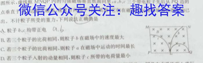 2.如图所示,有一半圆,其直径水平且与另一圆的底部相切于O点,O点恰好是半圆的圆心,二者处在同一竖直平面内。现有三条光滑轨道AO、COD、EOF,,它们的两端分别位于上下两圆的圆周上,轨道与竖直直径的夹角关系为α>β>θ。,现让一小物块先后从三条轨道顶端由静止下滑至底端,则小物块在每一条倾斜轨道上滑动时所经历的时间关系为A.tAB=tCD=tEB.tAB=tCD 如图所示,虚线框MNQP内的匀强磁场垂直纸面向里,a,bc三个带电粒子先后从PO边的中点垂直于PQ边射入磁场,速度方向均平行于纸面,它们在磁场中运动的轨迹在图中标出。不计粒子所受的重力,下列说法正确的是A.粒子b、c均带正电a.bB.若三个粒子的比荷相同,则粒子b在磁场中的速度最大C.若三个粒子的比荷相同,则粒子a在磁场中运动的时间最长D.若三个粒子入射的动量相同,则粒子c所带的电荷量最小安徽省六安市2023年秋学期八年级第一次综合素质评价z物理第二部分(待更新)