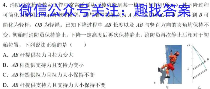 4.消防员在抢险救灾工作中常常需要从顶楼直降到某一楼层(如图甲所示),其下降过程可简化为如图乙所示的物理模型:脚与墙壁接触点为A点,人的重心在B点,A到B可简化为轻杆,OB为轻绳。已知下降过程中AB长度以及AB与竖直方向的夹角均保持不变。初始时消防员保持静止,下降一定高度后再次保持静止,消防员再次静止后相对于初始位置,下列说法止确的是()A.AB杆提供拉力且拉力变大B.AB杆提供支持力且支持力变小C.AB杆提供拉力且拉力大小保持不变D.AB杆提供支持力且支持力大小保持不变