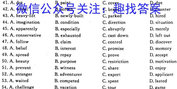 41.A.dot B.paint C.cover D.dye42.A.wheel B.screen C.brake D.counter43.A.heavy-lift B.newly-built C.parked D.hired44.A.imagination B.condition C.direction D.situation45.A.apparently B.especially C.abruptly D.merely46.A.conservative B.exhausted C.cast down D.heft out47.A.follow B.claim C.control D.discover48.A.belief B.interest C.promise D.memory49.A.spread B.repay C.prove D.accept50.A.beauty B.purpose C.restriction D.motivation51.A.prevent B.witness C.share D.enjoy52.A.stranger B.adventurer C.exper D.applicant53.A.waited B.compete d C.spent D.lasted54.A.challenge B.vacation C.tour D.game________________