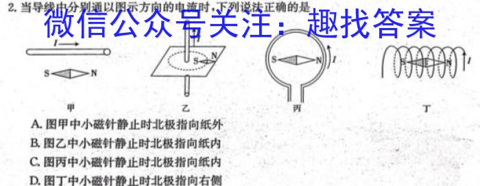 2.当导线中分别通以图示方向的电流时,下列说法正确的是A.图甲中小磁针静止时北极指向纸外B.图乙中小磁针静止时北极指向纸内C.图丙中小磁针静止时北极指向纸内D.图丁中小磁针静止时北极指向右侧