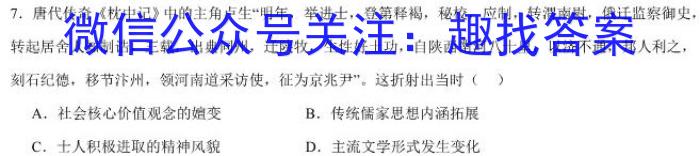 7.唐代传奇《枕中记》中的主角卢生“明年,举进士,登第释褐,秘校,应制,转渭南尉,俄迁监察御史,转起居舍人知制造,三载,出典同州,迁陕牧,生性好土功,自陕西凿河八十里,以济不通,邦人利之,刻石纪德,移节汴州,领河南道采访使,征为京兆尹”。这折射出当时()A.社会核心价值观念的嬗变B.传统儒家思想内涵拓展C.士人积极进取的精神风貌D.主流文学形式发生变化
