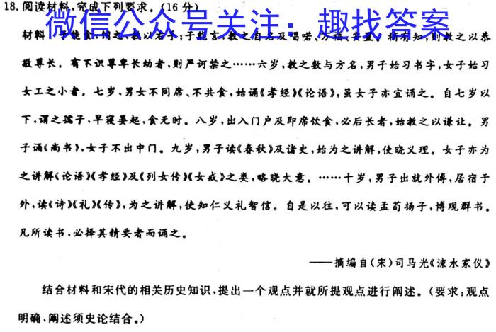 18.阅读材料,完成下列要求。(16分)材料于能食,饲之,救以右手;子能言,救之自名及唱、万福、安置。稍有知,则教之以恭敬尊长。有不识尊卑长幼者,则严诃禁之……六岁,教之数与方名,男子始习书字,女子始习女工之小者,七岁、男女不同席、不共食,始诵《孝经》《论语》,虽女子亦宜诵之。自七岁以下,谓之子,早寝晏起,食无时。八岁,出入门户及即席饮食,必后长者,始教之以谦让。男子诵《尚书,女子不出中门。九岁,男子读《春秋》及诸史,始为之讲解,使晓义理。女子亦为之讲解《论语》《孝经》及《列女传》《女戒》之类,略晓大意。……十岁,男子出就外傅,居宿于外,读《诗》礼传》,为之讲解,使知仁义礼智信。自是以往,可以读盂苟扬子,博观群书。凡所读书,必择其精要者而诵之。—摘编自(宋)司马光《谏水家仪》结合材料和宋代的相关历史知识,提出一个观点并就所提观点进行阐述。(要求:观点明确,阐述须史论结合,)