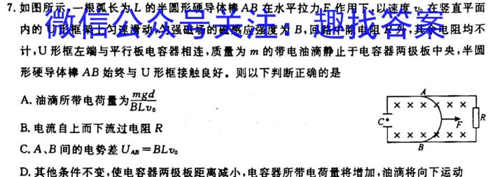 7.如图所示,一根弧长为L的半圆形硬导体棒AB在水平拉力F作用下,以速度v0在竖直平面内的U形框架上匀速滑动,匀强磁场的磁感应强度为B,回路中除电阻R外,其余电阻均不计,U形框左端与平行板电容器相连,质量为m的带电油滴静止于电容器两极板中央,半圆形硬导体棒AB始终与U形框接触良好。则以下判断正确的是D.其他条件不变,使电容器两极板距离减小,电容器所带电荷量将增加,油滴将向下运动