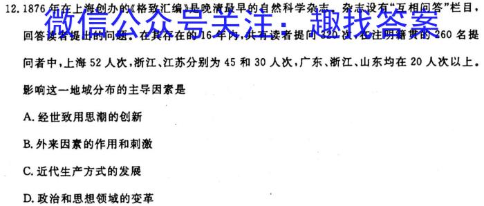 12.1876年在上海创办的《格致汇编》是晚清最早的自然科学杂志。杂志设有“互相问答”栏目,回答读者提出的问题。在其存在的16年内,共有读者提问320次,在注明籍贯的260名提问者中,上海52人次,浙江、江苏分别为45和30人次,广东、浙江、山东均在20人次以上。影响这一地域分布的主导因素是A.经世致用思潮的创新B.外来因素的作用和刺激C.近代生产方式的发展D.政治和思想领域的变革