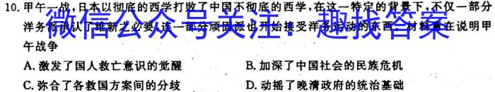 10.甲午一战,日本以彻底的西学打败了中国不彻底的西学,在这一特定的背景下,不仅一部分洋务派承认了维新之必要,连一部分顽固派也开始接受洋务运动的东西。材料意在说明甲午战争A.激发了国人救亡意识的觉醒B.加深了中国社会的民族危机C.弥合了各救国方案间的分歧D.动摇了晚清政府的统治基础