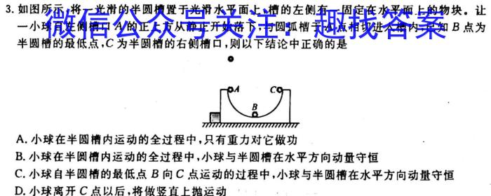 3.如图所示,将一光滑的半圆槽置于光滑水平面上,槽的左侧有一固定在水平面上的物块。让一小球自左侧槽口A的正上方从静止开始落下,与圆弧槽于A点相切进人槽内,已知B点为半圆槽的最低点,C为半圆槽的右侧槽口,则以下结论中正确的是A.小球在半圆槽内运动的全过程中,只有重力对它做功B.小球在半圆槽内运动的全过程中,小球与半圆槽在水平方向动量守恒C.小球自半圆槽的最低点B向C点运动的过程中,小球与半圆槽在水平方向动量守恒D.小球离开C点以后,将做竖直上抛运动