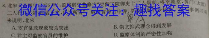 8.北宋天圣四年(1026年),监察御史曹修古“尝偕三院御史十二人晨朝,将至朝堂,黄门(太)二人行马不避,呵者止之,反为所置”。后经曹修古申诉,皇帝即刻下令杖责。这一事例可来说明,北宋AA.宦官乱政现象较为突出B.崇文抑武理念得到发展C.君主对监察官员的维护D.监察体制的严密性加强
