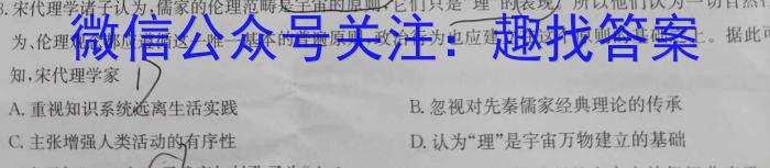 3.宋子认为,儒家的伦理范畴是宇宙的原则,它们只是“理”的表现所以他们认为一切自然行为、伦理观念都应遵循这一唯一基本的普遍原则,政治行为也应建立在这个原则的基础之上,据此知,宋代理学家17A.重视知识系统远离生活实践B.忽视对先秦儒家经典理论的传承C.主张增强人类活动的有序性D.认为“理”是宇宙万物建立的基础