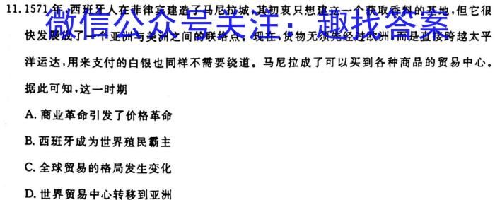 11.1571年,西班牙人在菲律宾建造了马尼拉城,其初衷只想建立一个获取香料的基地,但它很快发展成了一个亚洲与美洲之间的联络点。现在,货物无须先经过欧洲,而是直接跨越太平洋运达,用来支付的白银也同样不需要绕道。马尼拉成了可以买到各种商品的贸易中心。据此可知,这一时期A.商业革命引发了价格革命B.西班牙成为世界殖民霸主C.全球贸易的格局发生变化D.世界贸易中心转移到亚洲