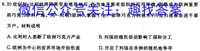 8.20世纪初,比利时将刚果变为殖民地后,在当地开展有组织的可可种植,刚果成为欧洲重要的巧克力原料产地。同一时期,欧洲人掌握了生产固体巧克力的技术,巧克力逐渐走进千家万户。材料说明A.比利时人垄断了欧洲巧克力产业B.列强的殖民活动影响了国际分工C.欧洲为中心的世界市场开始形成D.开启了列强在非洲的殖民地争夺