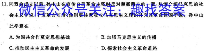 11.同盟会成立以后,在宣传自己革命主张时反对照搬西方的一套,热情介绍马克思的社会主义学说;辛亥革命前后,他则更注意吸收理论补充其革命建国学说。此举意在A.为国共合作奠定思想基础B.加强的传播C.推动民主主义革命的发展D.探索社会主义革命道路