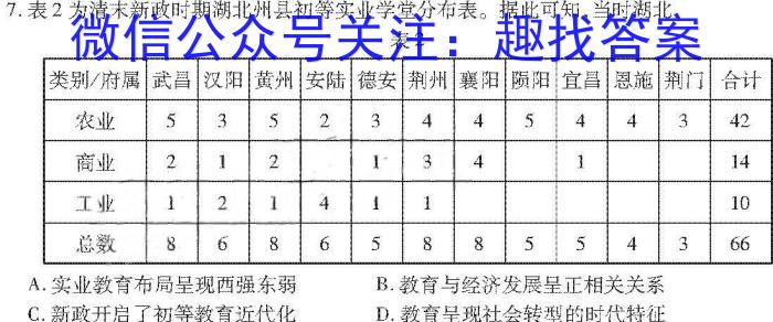 7.表2为清末新政时期湖北州县初等实业学堂分布表。据此可知,当时湖北表2A.实业教育布局呈现西强东弱B.教育与经济发展呈正相关关系C.新政开启了初等教育近代化D.教育呈现社会转型的时代特征