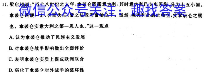 11.说:“当十八世纪之末年,拿破仑蹂躏意大利,其时意大利已支离灭裂,分为十五小国。拿破仑铁鞭一击,合而为三,置之法政府督治之下。虽然,意大利此后之独立,实拿破仑之赐也,拿破仑实意大利之第一恩人也。”这一观点A.认为拿破推动了民族主义发展B.对拿破仑战争影响做出全面评价C.表明拿破仑实质上促成欧洲联合D.弱化了拿破仑对外战争的破坏性