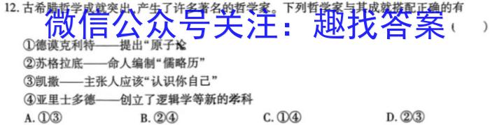 12.古希腊哲学成就突出,产生了许多著名的哲学家。下列哲学家与其成就搭配正确的有()②苏格拉底——命人编制“儒略历”①德谟克利特——提出“原子论③凯撒——主张人应该“认识你自己”④亚里士多德——创立了逻辑学等新的学科A.①③B.②④C.①④D.②③