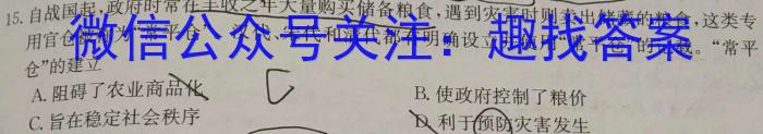 15.自战国起,政府时常在丰收之年大量购买储备粮食,遇到灾害时则卖出储藏的粮食,这类专用官仓被称为“常平仓”。汉代、宋代和清代都有明确设立并使用“常平仓”的记载。“常平仓”的建立A.阻碍了农业商品化化0B.使政府控制了粮价C.旨在稳定社会秩序D利于预防灾害发生