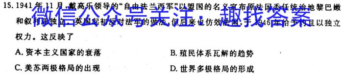 15.1941年11月,戴高乐领导的“自由法兰西军”以盟国的名义宜布原法国委任统治地鍪巴嫩和叙利亚独立。英国起初反对法军的做法,但后来也仿效法国,于1946年给予约且以独立权力。这反映了A.资本主义国家的衰落B.殖民体系瓦解的趋势C.美苏两极格局的出现D.世界多极格局的形成
