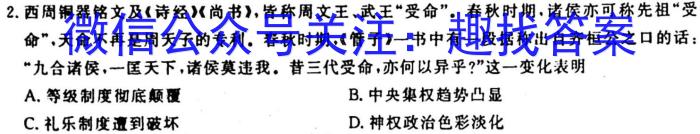 2.西周铜器铭文及《诗经》尚书》,皆称周文王、武王“受命”。春秋时期,诸侯亦可称先祖“受命”,天命不再是周天子的专利。春秋时期,《管子》一书中有一段据称出自齐桓公之口的话:“九合诸侯,一国天下,诸侯莫违我。昔三代受命,亦何以异乎?”这一变化表明A.等级制度彻底顺覆B.中央集权趋势凸显C.礼乐制度遭到破坏D.神权政治色彩淡化
