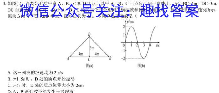 3.如图(a),在均匀介质中有A、B、C和D四点,其中A、B、C三点位于同一直线上,AC=BC=4m,DC=3m,D垂直AB.t=0时,位于A、B、C处的三个完全相同的横波波源同时开始振动,振动图像均如图(b)所示,振动方向与平面ABD垂直,已知波长为4m。下列说法正确的是()A.这三列波的波速均为2m/sB.t=1.5s时,D处的质点开始振动C.t=6s时,D处的质点位移大小为2cmD.A、B两列波不能发生干涉现象