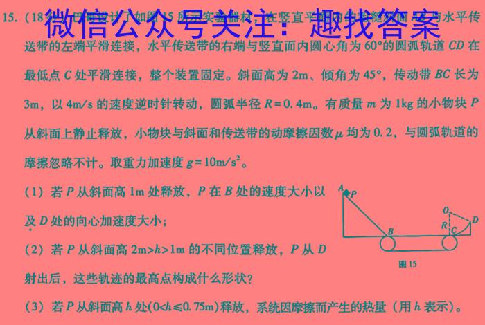 15.(18分)巴哥设计了如图15所示实验器材,在竖直平面内的粗糙斜面AB与水平传送带的左端平滑连接,水平传送带的右端与竖直面内圆心角为60^的圆弧轨道CD在最低点C处平滑连接,整个装置固定。斜面高为2m、倾角为45^,,传动带BC长为3m,以4m/s的速度逆时针转动,圆弧半径R=0.4m。,有质量m为1kg的小物块P从斜面上静止释放,小物块与斜面和传送带的动摩擦因数均为0.2,与圆弧轨道的摩擦忽略不计。取重力加速度g=10m/s^2。(1)若P从斜面高1m处释放,P在B处的速度大小以及D处的向心加速度大小;A(2)若P从斜面高2m>h>1m的不同位置释放,P从D射出后,这些轨迹的最高点构成什么形状?(3)若P从斜面高h处((0