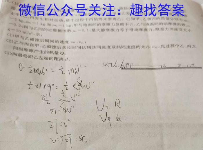 16.(12分)如图所示,长禾板之静在粗糙的水平地而上,物块(可画为点在之差端,物块甲从乙侧以0m/s的速度向左运动,甲与乙发生弹性时技芝彩走甲、之、丙发生相对运动、整个过程中丙始终未滑离乙,已知甲、乙和丙的质量分别为ym2kg、m2=1kg运动、整个过程中丙-2kg、m-1kgfm=1kg,甲与地而间的摩擦力忽略不计,乙与地面间的动摩擦数p=0.2.丙与乙间的动摩擦因数y=0.1,最大静摩擦力等于滑动摩擦力,取重力加速度大小8=10m/s^2,g=10m/s.求:n1=0.1,(1)甲与乙碰撞后瞬间的速度vm、2.:(2)乙与丙在甲、乙碰撞后多长时间达到共同速度及共同速度的大小v·此过程中乙、丙之间因摩擦产生的热量Q;Q(3)丙最终距乙左端的距离d。dc以V:8