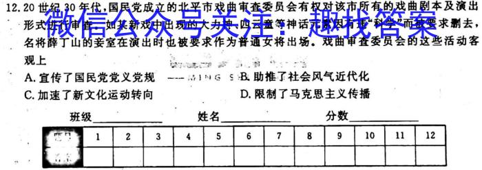 12.20世纪30年代,国民党成立的北平市戏曲审查委员会有权对该市所有的戏曲剧本及演出形式进行审查。如某新戏中出现的大力神、四云童等神话元素因有违“科学”而被要求删去,名将薛丁山的妾室在演出时也被要求作为普通女将出场。戏曲审查委员会的这些活动客观上A.宜传了国民党党义党规GB.助推了社会风气近代化C.加速了转向D.限制了传播班级姓名分数