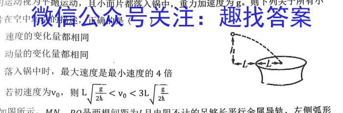 片的运动视为平抛运动,且小面片都落入锅中,重力加速度为g。则下列关于所有小面片在空中运动的描述,正确的是()A.速度的变化量都相同B.动量的变化量都相同C落入锅中时,最大速度是最小速度的4倍D.若初速度为v,则V0,Lg2h