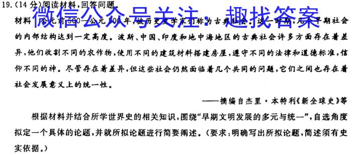 材料公元前500一公元500年,被历史史学家们称为古典社会。这一时期,几个早期社会的内部结构达到一定高度。波斯、中国、印度和地中海地区的古典社会许多方面存在着差异,他们收割不同的农作物,使用不同的建筑材料搭建房屋,遵守不同的法律和道德标准,信社会发展意义上的统一性。——摘编自杰里·本特利《新全球史》等拟定一个具体的论题,并就所拟论题进行简要阐述。(要求:明确写出所拟论题,简述须有史实依据。)19.(14分)阅读材料,回答问题。仰不同的神。尽管存在着差异,但这些社会仍然面临着几个共同的问题,它们之间也存在着根据材料并结合所学世界史的相关知识,围绕“早期文明发展的多元与统一”,自选角度