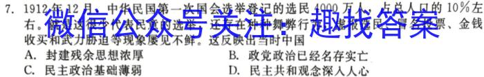 7.1912年12月,中华民国第一次国会选举登记的选民4000万人,占总人口的10%左右。就是这很少代表民意的选举,还存在种种舞弊行为,虚报选民、冒名投票、金钱收买和武力胁迫等现象屡见不鲜。这反映出当时中国A.封建残余思想浓厚B.政党政治已经名存实亡C.民主政治基础薄弱D.民主共和观念深入人心
