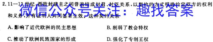2.11一13世纪,西欧封建主之间普遍结成封君、封臣关系,以契约的方式明确约定双方的权利和义务,并有证明人共同签署生效。这种契约关系A.影响了近代欧洲的民主思想B.削弱了教会特权C.推动了欧洲民族国家的形成D.强化了专制王权
