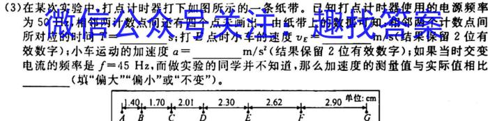(3)在某次实验中,打点计时器打下如图所示的一条纸带。已知打点计时器使用的电源频率为50Hz,相邻两计数点间还有四个点未画出。由纸带上的数据可知:相邻两个计数点间所对应的时间T=s;打E点时小车的速度vE=m/s(结果保留2位有效数字);小车运动的加速度a=m/s^2(结果保留2位有效数字);如果当时交变电流的频率是f=45Hz,而做实验的同学并不知道,那么加速度的测量值与实际值相比(填“偏大”“偏小”或“不变”)。